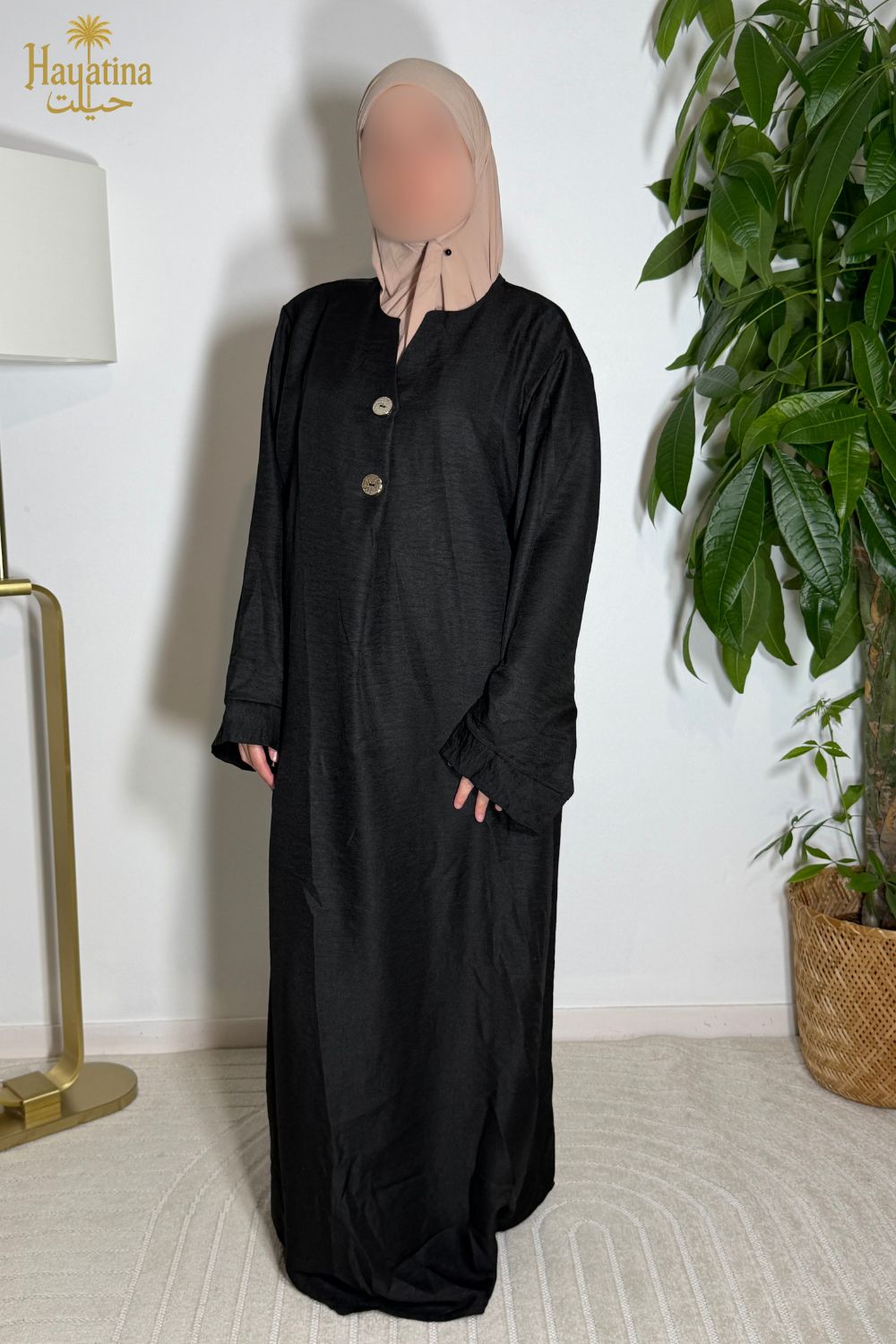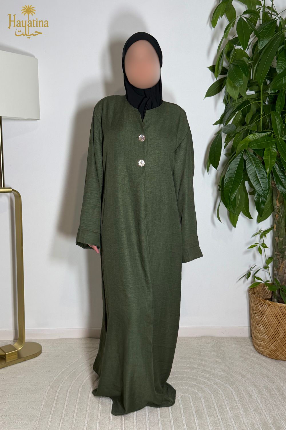 Abaya effet lin, col tunisien, avec boutons dorés.